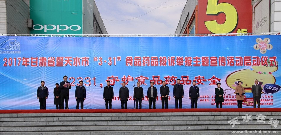 3月31日,2017年甘肃省暨天水市“12331”食品药品投诉举报主题宣传活动启动仪式在天水市龙城广场隆重举行。此次活动由省食品药品监督管理局、天水市人民政府主办,省食品药品安全投诉举报中心、天水市食安办、天水市食品药品监督管理局、秦州区人民政府、麦积区人民政府承办。