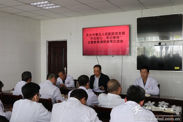 10月23日下午,天水市第五人民医院召开“不忘初心、牢记使命”主题教育调研成果交流会。全体党员干部、入党积极分子、科室负责人40余人参加了大会,会议由院党支部书记、院长潘临平主持。