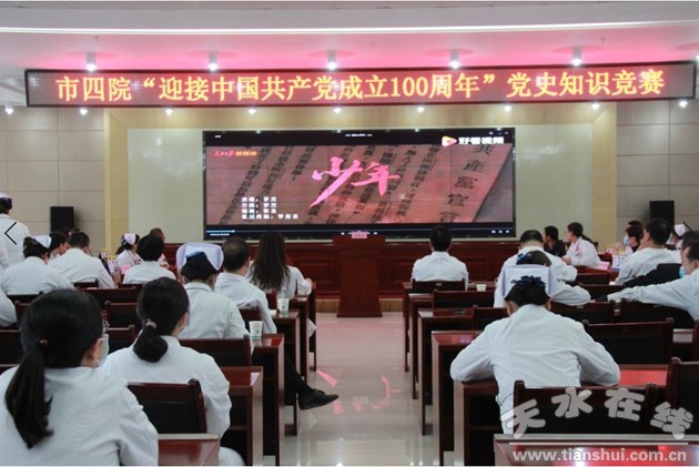 为庆祝中国共产党百年华诞,回顾党的光辉历程,营造学党史、知党情、跟党走的浓厚氛围,进一步丰富党史学习教育内容,激发广大党员干部积极向上、爱岗敬业的工作热情。4月23日,天水市第四人民医院党委举办了“迎接中国共产党成立100周年”党史知识竞赛活动,掀起党史学习热潮。
