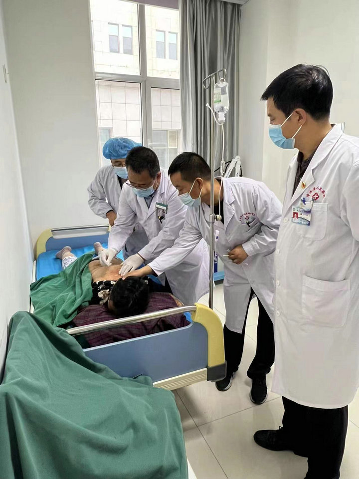 此次义诊活动内容主要包括学术讲座、业务查房、中医适宜技术培训和义诊活动。其中学术讲座由医保科科长韩永霞以我院DRG付费试点工作开展情况进行了专题培训;骨二科主任李明雄就膝关节骨性关节炎单髁人工关节置换术为主题进行了学术交流;急诊科主治医师杨有有对其科室开展的断指(肢)再植新业务作了详细介绍。针灸科副主任黄继升开展了以拔罐、灸法操作为主要内容的中医适宜技术培训。疼痛科主任尤志侠就1例胸背肌筋膜炎和1例胸椎压缩性骨折门诊患者分别行胸椎旁神经阻滞和肌筋膜触发点针刺松解术治疗并进行现场示范带教。介入科主任陈亮就1例消化道出血和1例乳腺癌术后肺转移患者进行了业务查房。