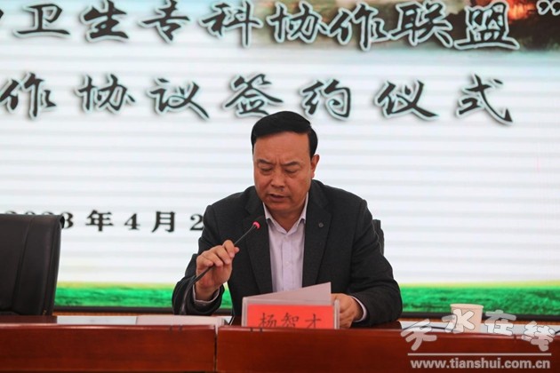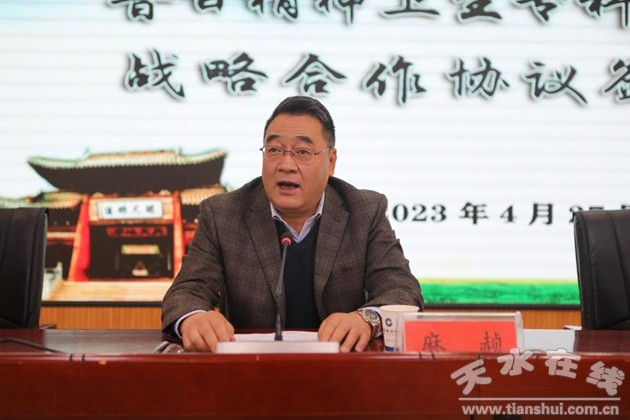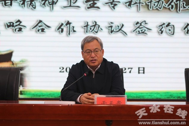 麻赪书记首先代表医院致辞。麻书记对于天贵书记一行来我院出席签约仪式表示欢迎,感谢双方促成本次战略合作的所有人员作出的努力。他介绍了医院的建院历史和发展建设中所取得的成就,并表示山东精神卫生中心和天水市第三人民医院都有着与生俱来的红色基因和光荣的革命传统,我们将努力学习山东省精卫中心的先进技术和超前理念,持续深化人才培养、学科建设、医疗护理服务质量、医院管理等方面合作,建立紧密的医联体合作机制,全力推动我市精神卫生事业实现新的突破、迈向新的阶段,为“健康天水”建设作出新的更大贡献。