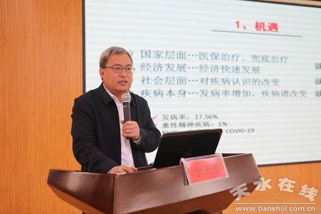 签约仪式结束后,山东省精神卫生中心党委书记于天贵作了题为《精神专科医院未来发展的若干思考》的学术报告。在医院发展、业务提升、人才队伍培育和科研教学等方面分享了宝贵经验。