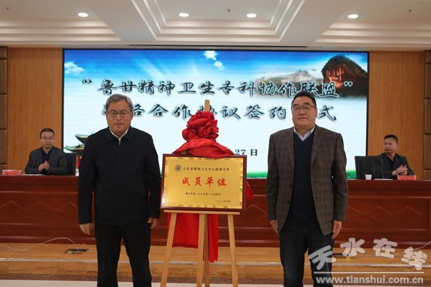 山东省精神卫生中心党委书记于天贵、山东省精神卫生中心运营发展部邢金水部长、于志勇科长,兰州大学第二医院心理科主任董强利、天水市卫生健康委员会副主任杨智才,我院院党委书记麻赪、院长李刚及医院党政领导班子成员参加仪式。