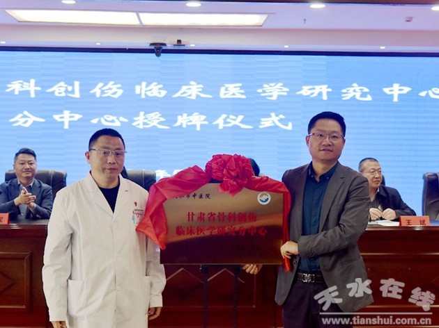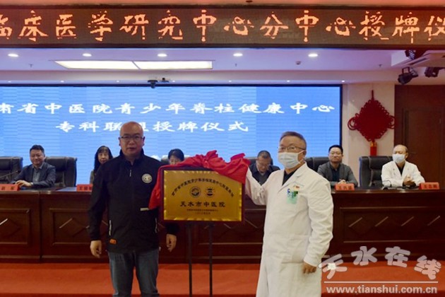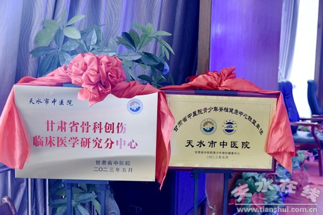 启动仪式上,天水市中医医院被设立为“甘肃省骨科创伤临床医学研究中心分中心”和“甘肃省中医院青少年脊柱健康中心专科联盟成员单位”,王兴盛、温剑涛、马小军、天水市中医医院骨伤科主任谢培均分别为“分中心”和“专科联盟成员单位”进行了揭牌。