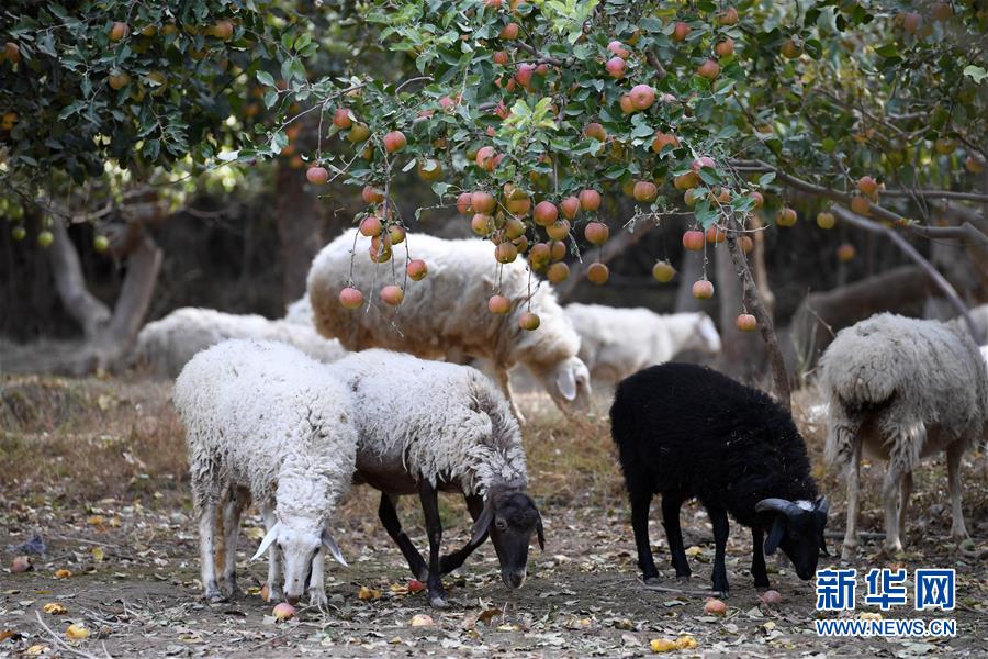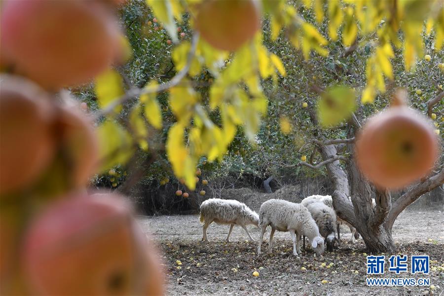 10月24日,羊群在敦煌市郭家堡镇一处果园里觅食。新华社记者 马宁 摄