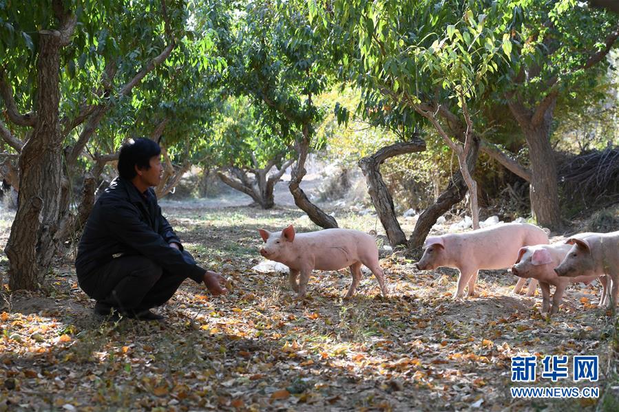 10月24日,在敦煌市郭家堡镇梁家堡村,村民龚建军在自家果园中照看猪群。新华社记者 马宁 摄