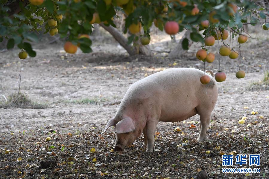 10月24日,在敦煌市郭家堡镇一处果园,一头猪在果树下觅食。新华社记者 马宁 摄