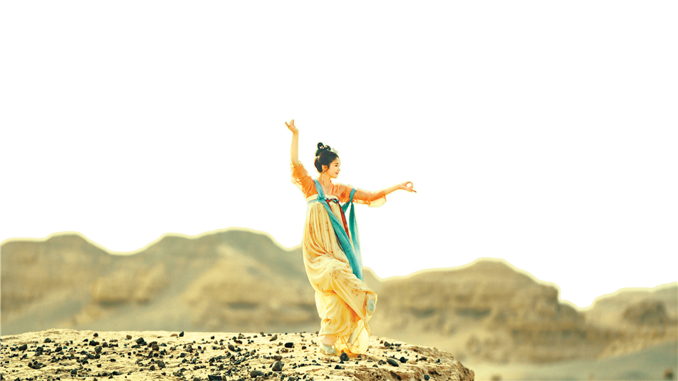 为极致呈现敦煌美学,《舞动敦煌》采用实景拍摄。连绵的沙丘铺向天际,驼铃声声漫过沙脊,光影摇曳中,千年的飞天、伎乐天形象翩然灵动。