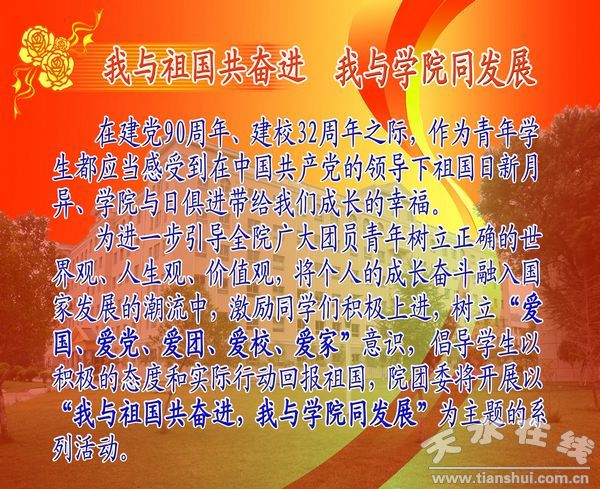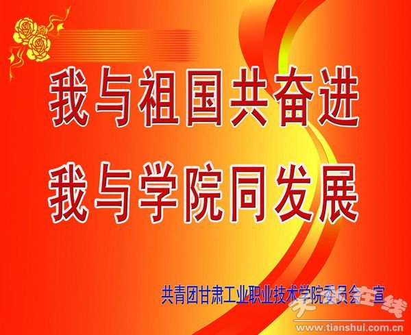 为适应甘肃工业职业技术学院青年学生思想实际和成长发展需求, 深入宣传党的十七届五中全会和2011年全国“两会”精神,宣传“十一五”时期经济社会发展的巨大成就和宝贵经验,宣传“十二五”时期经济社会发展的指导思想、总体思路、目标任务和重大举措,宣传党和国家的重要政策,引导学院学生进一步增强学习贯彻党的十七届五中全会精神的自觉性和主动性,增强贯彻落实科学发展观、加快转变经济发展方式的责任感和紧迫感,积极投身改革开放和社会主义现代化建设,为实现“十二五”目标充分发挥生力军作用,甘肃工职学院党委宣传部和院团委按照团中央《关于组织开展“我与祖国共奋进”形势政策教育活动的通知》,结合学院形势与政策课开设要求,正式启动“我与祖国共奋进 我与学院同发展”形势政策系列教育活动。