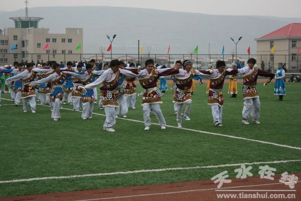 甘肃机电学院赵彦军副院长主持了开幕式。入场仪式结束后,全体师生在庄严的国歌声中举行了升国旗仪式。随后大会组委会副主任李自勇副院长致开幕词。王芳弟副书记宣读了精神文明奖评比办法,裁判员及运动员代表上台宣誓。最后,李宗义院长庄重宣布:甘肃机电职业技术学院第一届田径运动会开幕。此时,体育场掌声雷鸣,欢声雷动,彩旗飞扬。在学院各系部组织了健美操、军体拳、民族舞、校园华尔兹等精彩的文艺表演后,各项竞赛正式开始。