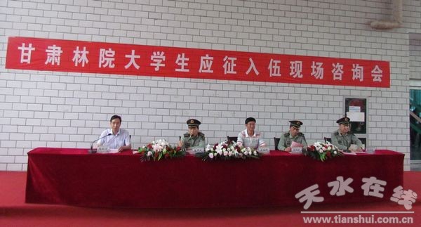 为了贯彻落实省教育厅《关于召开2012年全省高校毕业生入伍工作》视频会议精神,配合学院做好2012年大学生入伍预征宣传咨询工作,帮助甘肃林业职业技术学院毕业生及在校生了解应征入伍的相关政策,该院于5月31日下午邀请了麦积区人民武装部部长魏君武、政委杨联继、副部长鲁国玺,组织召开了2012届、2013届毕业生应征入伍政策咨询会。学院副院长冉福祥出席,会议由学生处副处长杨航宇主持。