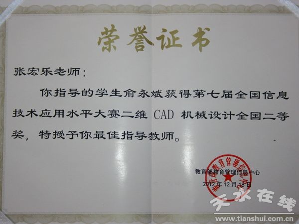 12月16至18日,由教育部教育管理信息中心举办的“第七届全国信息技术应用水平大赛”决赛在北京科技大学举行。甘肃机电学院现代制造工程系G102201班俞永斌同学获得二维CAD机械设计全国二等奖,指导教师张宏乐获得“最佳指导教师”称号。