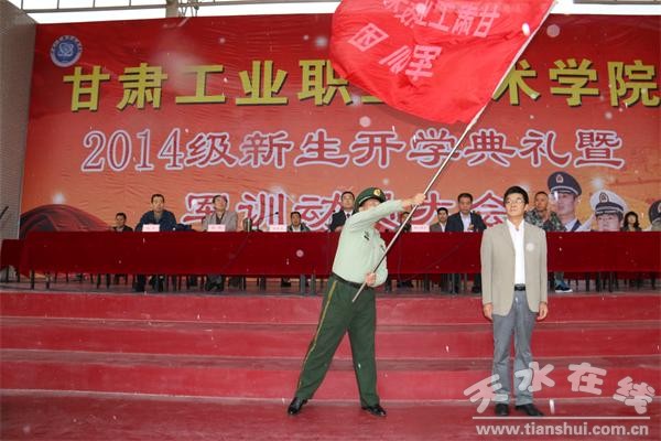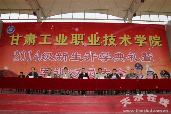 9月15日上午,甘肃工业职业技术学院在该校田径场举行2014级新生开学典礼暨军训动员大会,热烈欢迎2014级新同学的到来。该校领导和迎新工作领导小组成员、军训工作领导小组成员,各学院、职能部门负责人、辅导员参会。开学典礼暨军训动员大会由该校副校长鲁挑建主持。