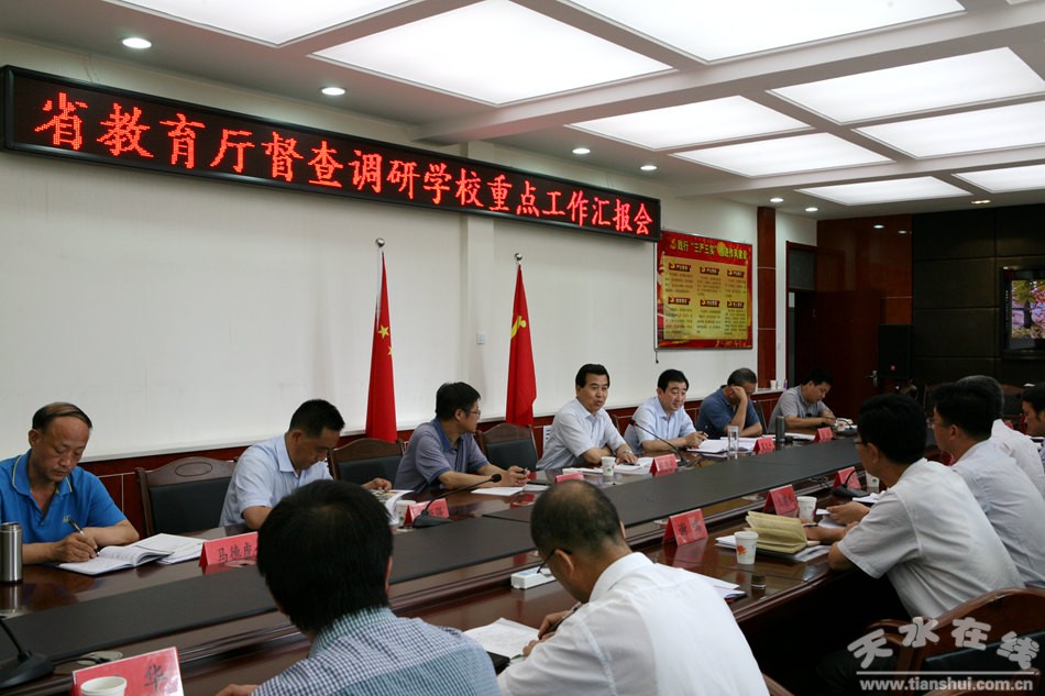 陈厅长先后实地察看了学校的基础设施、实训基地、众创空间和电商中心,详细了解了职教资源整合、示范校建设、农业科技培训、教学科研、互联网+职业教育、集团化办学等重点工作的进展情况,并召开了督查调研座谈会。座谈会上,陈厅长强调指出,天水农校在打破行业部门界限抓资源整合、县校联动抓职教、发挥涉农专业优势抓科研、依据农户需求抓培训、依托“互联网+”抓精准扶贫、秉承传统文化抓人才培养等方面形成了自己的特色,在全省中职院校中重具有典型性和代表性,充分发发挥了示范辐射带动作用。同时,对学校下一步发展提出了很好地建设性意见和建议。市政府副市长霍卫平建议省教育厅把筹建天水农业工程职业学院事宜列入全省“十三五”高等教育发展规划,并要求农校要以这次督查调研为契机,认真梳理调研组反馈的意见,提出切实可行的实施方案,抓好贯彻落实。清水县委副书记、政协主席王新强表示,要举全县之力,支持天水农校发展,并就2016年清水县支持农校发展的十件实事进行了汇报说明。天水农校校长吴毅中,就学校近两年的重点工作从9个方面进行的简要汇报。市教育局、市农业局分管领导在会上做了表态发言。