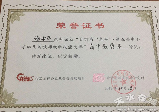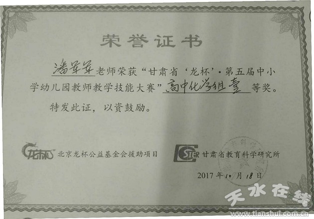 10月18日,由北京龙杯公益基金会援助项目、甘肃省教育科学研究所联合举办的“甘肃省‘龙杯’·第五届中小学幼儿园教师教学技能大赛”在兰州举行。天水一中潘军军老师获得高中化学组一等奖(第二名),谢君琴老师获得高中数学组三等奖(第一名)。
