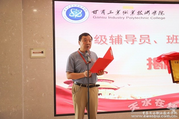 为深入贯彻落实全国高校思想政治工作会议精神,进一步推进辅导员队伍专业化、职业化、科学化发展,切实提升大学生思想政治教育工作实效,6月29日上午,甘肃工业职业技术学院首个省级辅导员名师工作室和名班主任工作室揭牌仪式成功举办。校党委副书记、院长安建平,副院长胡森林、曹惠清出席仪式,学工处负责人、各二级学院党支部副书记、全体专职辅导员参加。