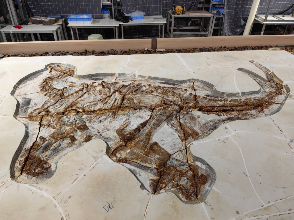 本次挖掘修复的剑龙类恐龙体长约5米,骨骼化石四周散布着完整的皮肤化石,面积约为3平方米,似鳞片状排列的纹路十分清晰。“恐龙的骨骼和牙齿等硬体部分相对容易形成化石,但是皮肤、肌肉等软体部分因容易腐烂,形成化石的条件极为苛刻。”张福成说,其保存面积和完整程度在世界范围内都罕见。