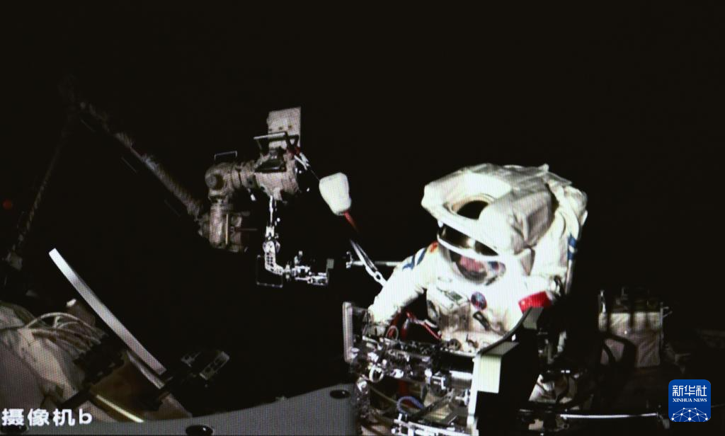 3月2日,在北京航天飞行控制中心拍摄的神舟十七号航天员汤洪波在空间站组合体舱外作业。新华社记者 李贺 摄