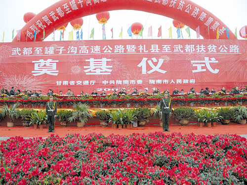 奠基仪式由省委常委、秘书长姜信治主持。省委副书记、省长徐守盛作了重要讲话,省委书记、省人大常委会主任陆浩宣布武罐高速公路暨礼县至武都扶贫公路工程奠基。奠基仪式上,省交通厅厅长杨咏中介绍了武罐高速公路暨礼县至武都扶贫公路工程情况,陇南市委书记王义和农民代表梁合义先后发言。省直有关部门和陇南市委、市政府的领导,与当地数万群众一起共庆我省陇南地区第一条高速公路开工建设。