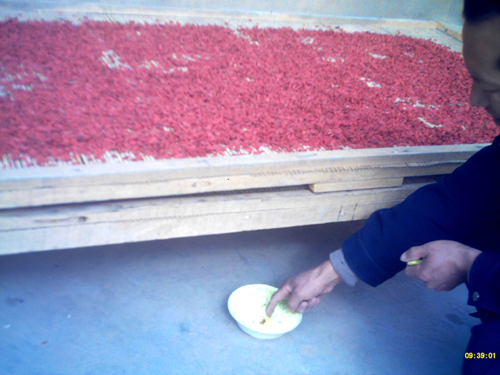 按照枸杞市场规矩,被硫磺熏过的叫“磺货”,天然晒制成的叫“本色货”。分辨的方法首先是看:颜色鲜红光亮的是“磺货”,色泽偏暗的是“本色货”;其次是摸:“磺货”触手有粘黏感,而“本色货”则相对干燥;其三是尝:“本色货”酸中带甜,“磺货”则有很重的酸苦味。