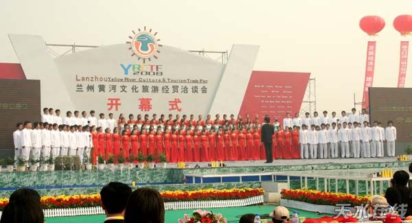 当天的开幕式现场洋溢着热烈、喜庆的氛围,飞天、羊皮筏子、水车、秦腔这些代表着黄河文化的元素传达着本届盛会的内涵,喷泉、礼花、极具现代感的舞台设计表达着兰州人民继续解放思想,深化改革开放,努力实现兰州经济又好又快发展的信心和决心。