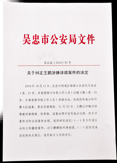 宁夏吴忠市公安局《关于纠正王鹏涉嫌诽谤案件的决定》(12月2日摄)。