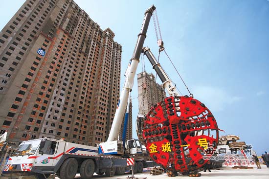 兰州城市轨道交通项目全面推进。日前,首台盾构机——“金城一号”在位于安宁区的世纪大道站吊装下井。本报记者刘健