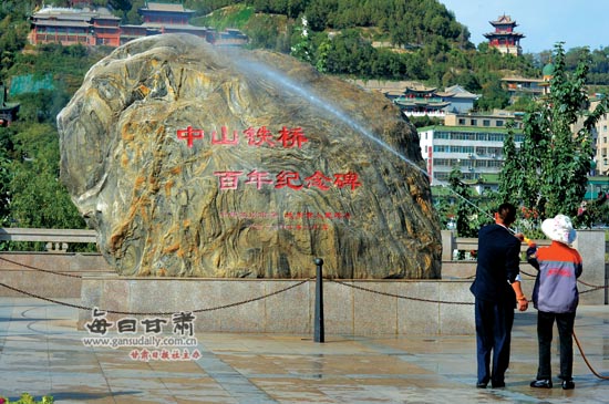 下午4时许,中山桥附近的游客熙熙攘攘,在“全民洗城”行动中,黄河风情线管理办公室的工作人员正在对中山桥两侧广场上的景观设施进行清洗,在中山桥南广场上,“黄河第一桥”与“中山铁桥百年纪念碑”的石雕景观上方布满浮土,经过工作人员的清洗,两块石雕景观焕然一新。在行动中,工作人员驾驶小型洒水车,对中山桥两侧广场的地面以及黄河风情线沿线的观景大道进行了全面清洗,整个黄河风情线的空气也清新了许多。