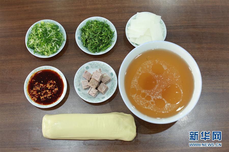 这是在兰州市一家牛肉面馆内拍摄的制作牛肉面需要的食材(4月2日摄)。 兰州牛肉面是“中式三大快餐”之一,拥有百年历史。它以“一清(汤清)、二白(萝卜片白)、三红(辣椒油红)、四绿(香菜、蒜苗绿)、五黄(面条黄亮)”的特色而蜚声中外。经过反复揉搓的面团在牛肉面师傅手中变化成粗细不一、圆扁不同的十余种面型。决定牛肉面味道的关键是浇在面条上的“老汤”,各个店家都有自己独特的汤料配方。从下锅煮面到端上餐桌,短短几分钟,一碗热腾腾的牛肉面便制作完成。冒着热气的汤面搭配各色辅料让食客唇齿留香,受到广泛欢迎。 新华社记者马平摄