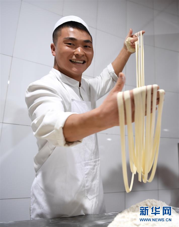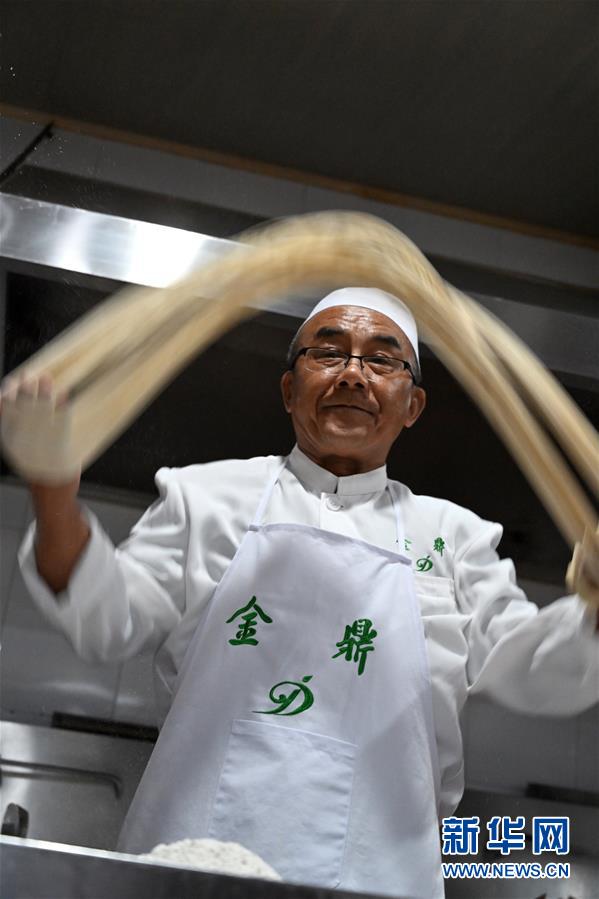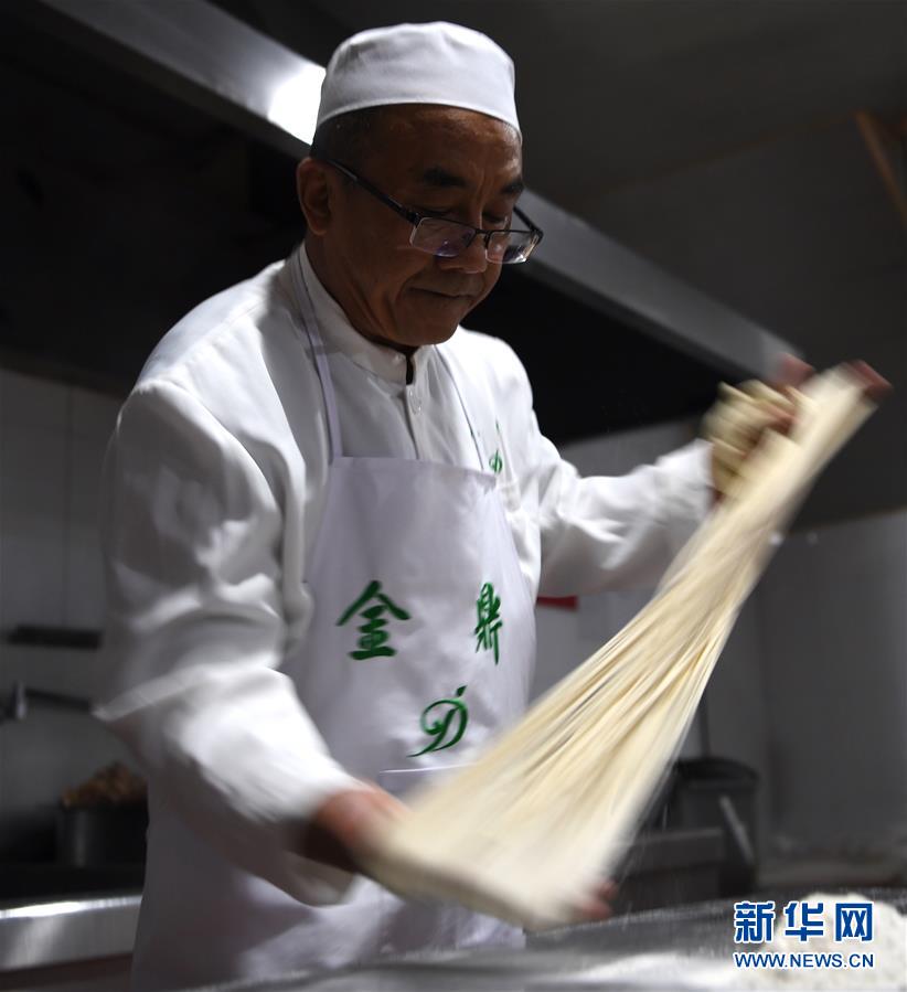 在兰州市一家牛肉面馆内,兰州牛肉面创始人马保子第四代传人马文斌在制作牛肉面(4月2日摄)。
