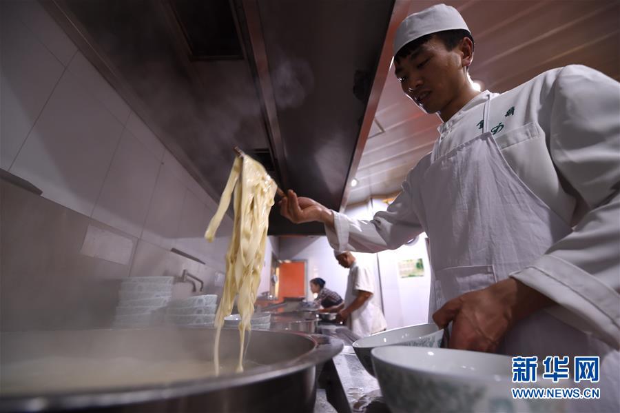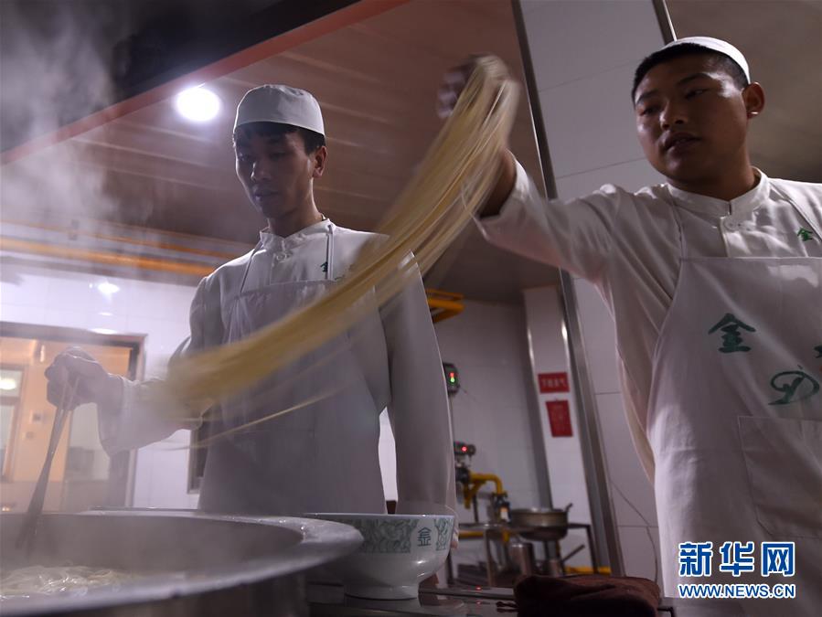 在兰州市一家牛肉面馆内,牛肉面师傅在捞面(4月2日摄)。 兰州牛肉面是“中式三大快餐”之一,拥有百年历史。它以“一清(汤清)、二白(萝卜片白)、三红(辣椒油红)、四绿(香菜、蒜苗绿)、五黄(面条黄亮)”的特色而蜚声中外。经过反复揉搓的面团在牛肉面师傅手中变化成粗细不一、圆扁不同的十余种面型。决定牛肉面味道的关键是浇在面条上的“老汤”,各个店家都有自己独特的汤料配方。从下锅煮面到端上餐桌,短短几分钟,一碗热腾腾的牛肉面便制作完成。冒着热气的汤面搭配各色辅料让食客唇齿留香,受到广泛欢迎。 新华社记者范培珅摄