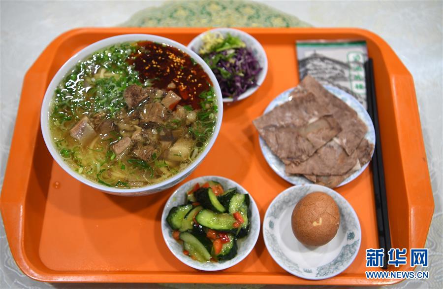 这是在兰州市一家牛肉面馆内拍摄的一份牛肉面套餐(4月2日摄)。 兰州牛肉面是“中式三大快餐”之一,拥有百年历史。它以“一清(汤清)、二白(萝卜片白)、三红(辣椒油红)、四绿(香菜、蒜苗绿)、五黄(面条黄亮)”的特色而蜚声中外。经过反复揉搓的面团在牛肉面师傅手中变化成粗细不一、圆扁不同的十余种面型。决定牛肉面味道的关键是浇在面条上的“老汤”,各个店家都有自己独特的汤料配方。从下锅煮面到端上餐桌,短短几分钟,一碗热腾腾的牛肉面便制作完成。冒着热气的汤面搭配各色辅料让食客唇齿留香,受到广泛欢迎。 新华社记者范培珅摄
