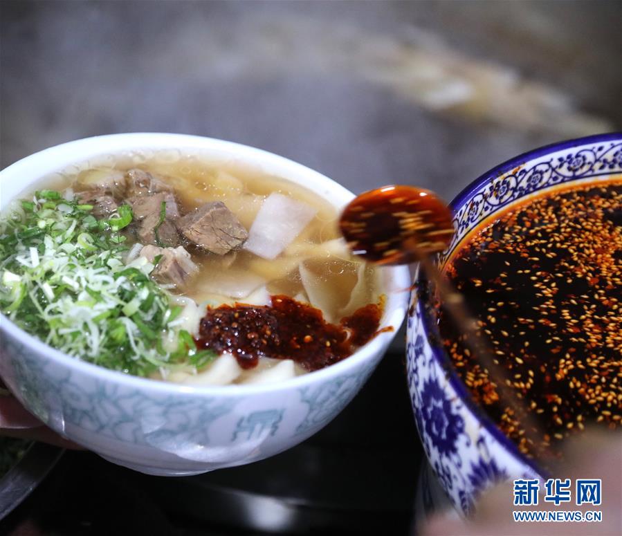 在兰州市一家牛肉面馆内,牛肉面师傅在往牛肉面中加辣椒油(4月2日摄)。