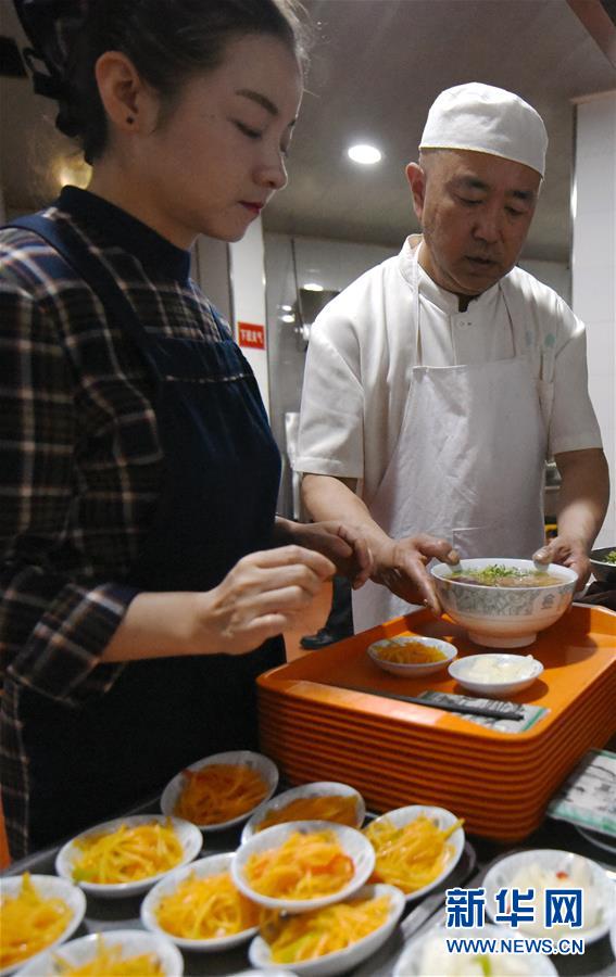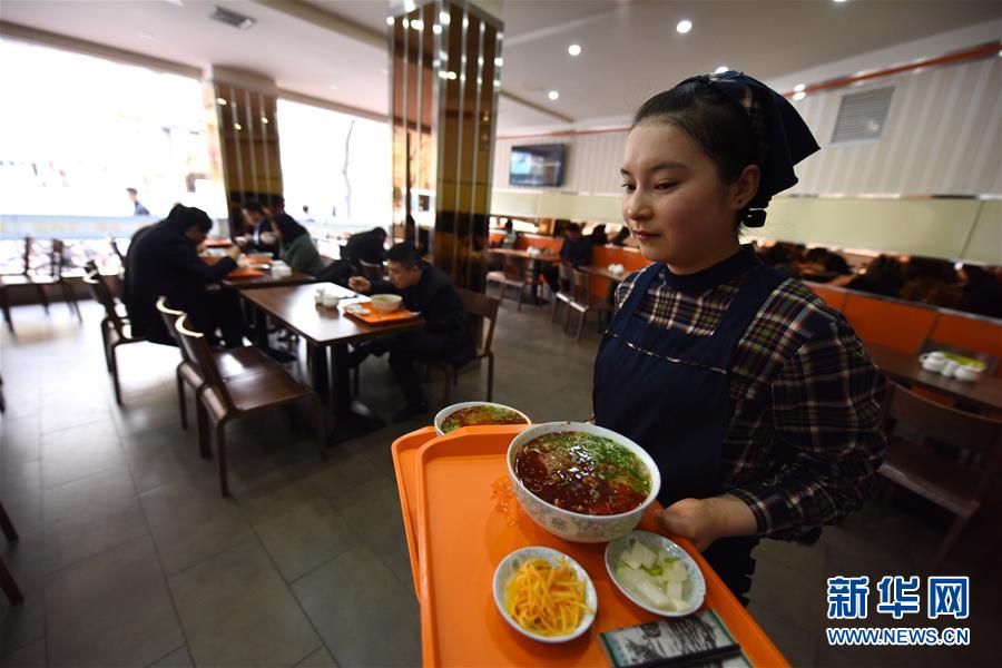新在兰州市一家牛肉面馆内,服务员为顾客端上牛肉面(4月2日摄)。
