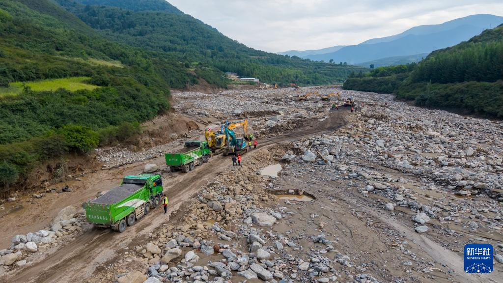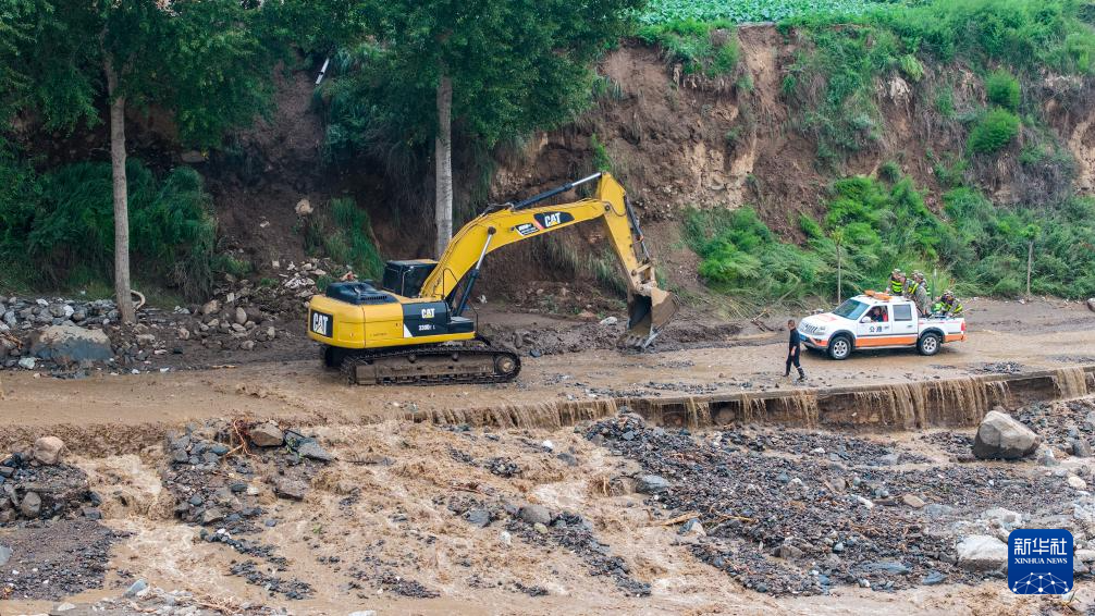 8月9日,在榆中县马坡乡马莲滩村,抢险人员抢修道路(无人机照片)。新华社记者 郎兵兵 摄