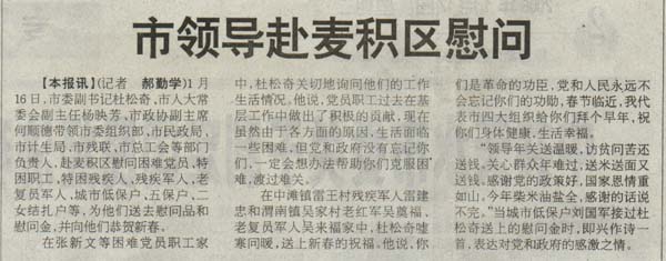 1月16日,市委副书记杜松奇、市人大常委会副主任杨映芳、市政协副主席何顺德带领市委组织部、市民政局、市计生局、市残联、市总工会等部门负责人,赴麦积区慰问困难党员、特困职工、特困残疾人、残疾军人、老复员军人、城市低保户、五保户、二女结扎户等,为他们送去慰问品和慰问金,并向他们恭贺新春。