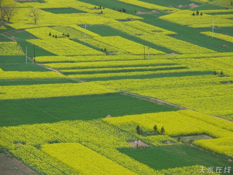 进入4月下旬以来,天水市大多数地区的油菜花陆续开花,给整个大地披上了金黄色的服装,图为麦积区中滩镇满山遍野的油菜花正在竞相开放。(甘肃省天水公路总段秦州公路管理段田国权)