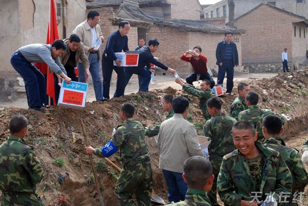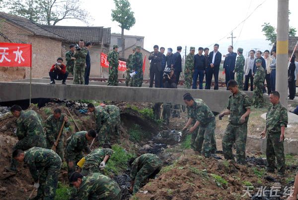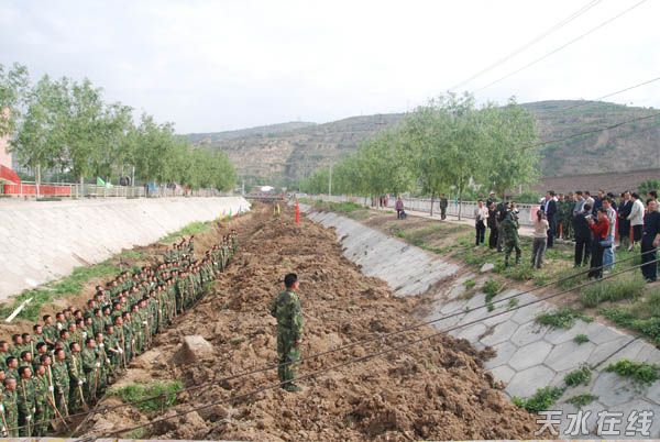 麦积区把此次清淤工作作为“三城联创、军地共建”的重点工作来抓,从5月9日开始,将集中利用三天时间,在排洪渠中清出一条宽4米、深1.5米的“渠中渠”。清淤活动得到了当地群众的热情支持,他们主动参与其中的同时,妇女、儿童还送茶送水,体现出良好、和谐的军民双拥关系。
