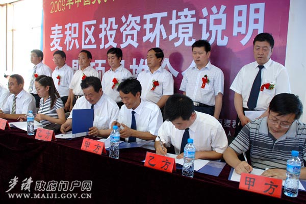 当天签约的投资项目有:山东威龙集团投资2.5亿元与石佛乡政府合作的6万亩鲜食葡萄出口基地及配套加工项目;天水汉唐陶艺公司投资1500万元与麦积镇政府合作的麦积山陶艺公司扩建项目;上海丽珠制药有限公司投资2000万元与二十铺工业示范区合作的天森药业扩建项目;宝鸡客商张根有投资1500万元与马跑泉镇政府合作的潘集寨村3000吨果蔬气调库项目;精诚果业有限公司投资3000万元与二十铺工业示范区合作的农产品速冻加工项目;上海大众汽车销售公司投资1800万元与麦积区农业局合作的万仕和汽车销售有限公司4S店建设项目;华伦商贸有限责任公司投资1100万元与社棠镇政府合作的社棠综合养殖小区建设项目;羲通公交(集团)有限公司投资1100万元与麦积区高新园合作的天水市高新汽车服务中心建设项目。