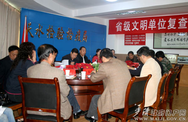 复查组一行先后深入麦积区武装部、市二院、滨河路社区、伯阳镇曹石村、天水检验检疫局、省林学院、甘泉镇、麦积山风景管理局等省级文明单位,通过实地察看、听取汇报、座谈交流、查阅资料、观看专题片等形式,对我区近年来精神文明建设取得的成绩进行了复查验收。