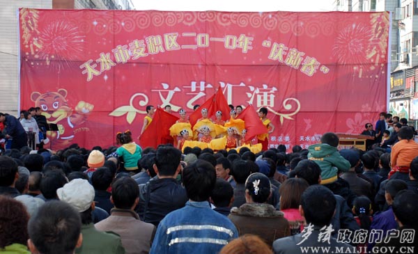 据了解,麦积区2010年“庆新春”文艺汇演从农历正月初八开始至正月十五结束,演出地点设在商埠路步行街十字街口,届时桥南、北道埠、道北三个街道办事处和该区秦剧团、农口系统、教育系统、文化系统将会为广大群众献上精彩的春节“文艺大餐”。