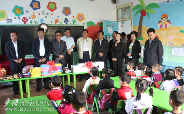 6月1日上午,天水市委副书记张应华,市委常委、副市长郭奇若,市政协副主席王凤保一行,在麦积区领导蒲军、张克强、马兆让、张思佳、王曙辉及市区相关部门负责人的陪同下,分别对麦积区建新路幼儿园、桥南小学、甘泉中心学校的教师和小朋友们进行了慰问,并为他们送去了学习用品和慰问金。