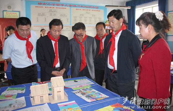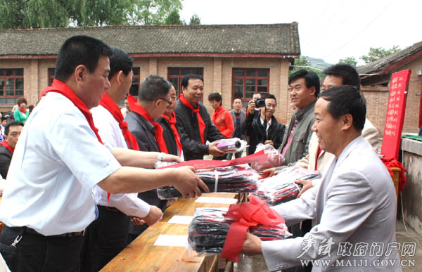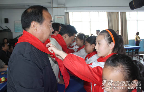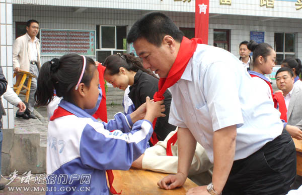 少先队员为麦积区委书记蒲军佩戴红领巾
