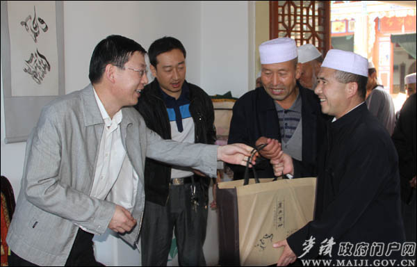 9月10日(农历八月初三日),是伊斯兰教的传统节日——开斋节。为了表达党和政府对广大少数民族群众的关怀,进一步促进民族团结,麦积区政协主席贾应珍,区委副书记马兆让,区委常委、马跑泉镇党委书记赵晓东,区委常委、组织部长张思佳和区人大常委会副主任马丽宏,区政协副主席海安民,区政协副主席、统战部长师雷现等领导带队组成四个慰问组,分别对少数民族聚居的马跑泉、花牛等七个乡镇和北道埠街道办事处伊斯兰教群众和宗教界人士进行了慰问。