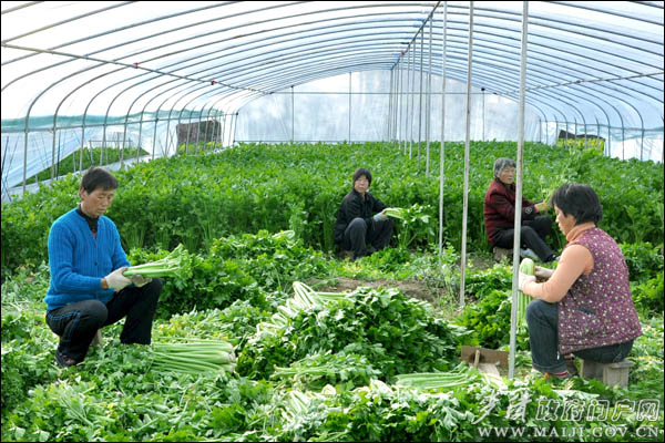 12日,中滩镇缑杨村村民在设施蔬菜基地大棚里收装、整理西芹菜。