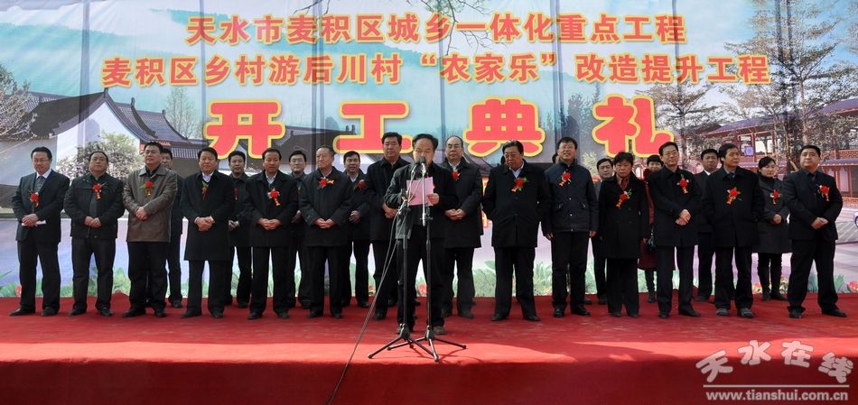 开工典礼上,麦积区委副书记、区长何东代表区四大组织对工程的顺利建设表示热烈祝贺。他说,近年来,麦积区不断加强旅游基础设施建设,加大旅游资源开发力度,着力优化旅游发展环境,旅游产业得到了较快发展。特别是麦积镇紧紧依托景区旅游资源优势,大力发展“农家乐”服务产业,打造形成了具有一定规模和较大优势的农家庭园旅游休闲服务体系,推动全区旅游服务业迈上了新台阶。他要求,后川村乡村游“农家乐”改造提升工程项目建设单位和施工单位要严格按照规划设计,精心组织,认真施工,高标准、高质量推进项目建设,全力把乡村游“农家乐”综合改造项目建成一项精品样板工程;麦积镇和区直相关部门要加强协作、密切配合,抢抓麦积山景区成功创建国家5A级景区的良好机遇,把市委、市政府提出的发展大旅游、建设大景区的思路与我区提出的围绕景区抓好服务工作的思路有机结合起来,全力实施好“农家乐”改造提升工程,确保把麦积镇打造成全市旅游强镇,把麦积区建设成天水旅游集散核心区和西部旅游休闲胜地。