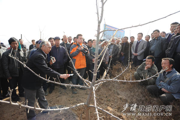麦积区委副书记、区长何东,麦积区委常委、副区长张永刚和天水市果品产业化办公室主任武文渊等领导出席。来自麦积区有关部门、乡镇负责人,果业技术人员以及50名农民技师参加了启动会。年过古稀的农民技师柳耀华老人向大家传授了果树修剪技术,博得了阵阵掌声。