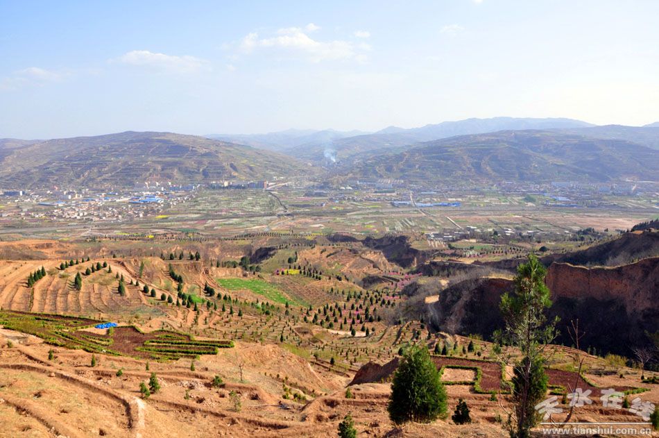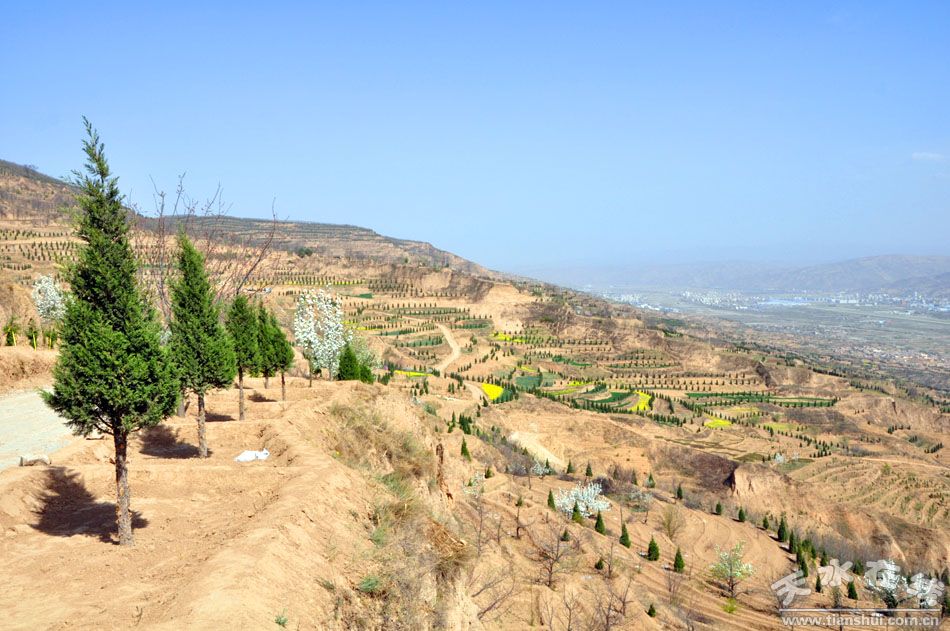 天水北山生态产业示范园西起秦州区玉泉镇瓦窑坡村,东至麦积区社棠镇石岭村,南起北山根,北至北山第一层山脊,规划面积约50平方公里。主要依托北山苹果、梨、核桃、柿子、枣、石榴等果品种植基地,配植一定景观树,建设百果园、生态园、示范园、观光游览园,并建设一定规模的休闲、娱乐、农家乐等服务设施。北山生态产业示范园的建设对天水城市空间的向北拓展、连接三阳川新区和拟建的天水机场,改善城市生态环境、扩大城市规模、发展循环农业、完善城市功能和北山地质灾害综合治理都有十分重大的意义。截止目前,在北山生态产业示范园已完成核桃、柿子、大樱桃、中华寿桃建园1621亩,道路绿化8公里,地埂绿化20公里,建园林小品4处,共栽植各类绿化、美化苗木22万株;新修“一横三纵”道路13.2公里,新打机井2眼,开挖调蓄池4座。苗木浇水,管网铺设和“一横一纵”道路硬化正在进行。