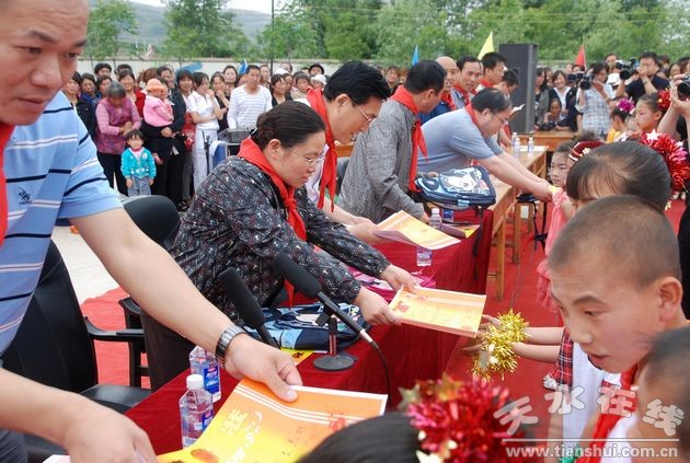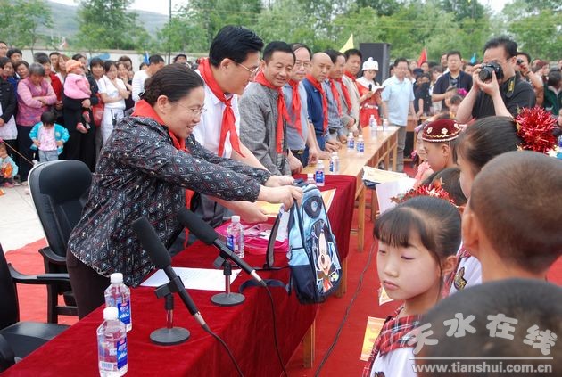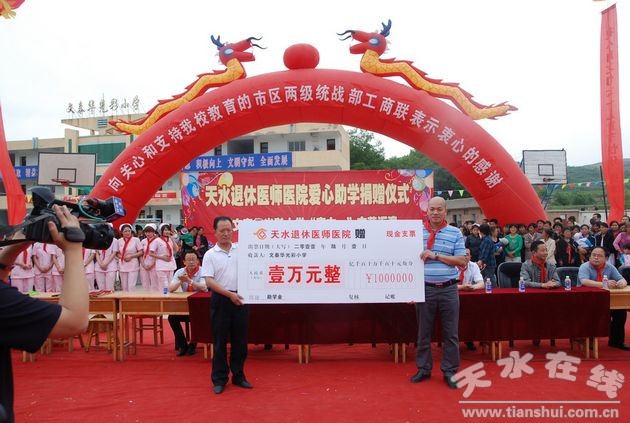 6月1日上午,在麦积区甘泉镇文泰华光彩小学,举行了“庆六一、献爱心” 天水退休医师医院捐资助学 活动。市委常委、统战部长李美华,市委副秘书长、督查室主任刘锋以及市区统战、工商联负责同志出席捐赠活动,并与师生共同欢度六一儿童节。联欢活动中,孩子们表演了精彩的文艺节目,38位优秀学生和100位师生满怀感激的心情接受了天水退休医师医院捐赠的书包和爱心体检卡。
