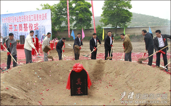 ——林业危旧房建设项目。省上下达麦积区2011年林业危旧房改造工程建设计划共267户13350m2,预算总投资5385.72万元,国家和省上配套资金已经到位,目前,完成了基础电网改造,5月举行了开工奠基仪式,正在进行地基开挖工作。